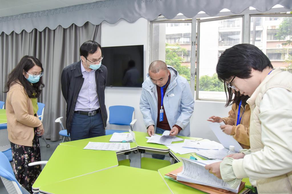 4月8-9日,我校开展了2023年硕士研究生招生复试(第一批)工作,100多名省内外考生来校参加了现场复试。8日上午,广东省教育考试院招考二处左俊副处长一行来校检查研招复试具体工作,学校副校长、研究生院院长胡文涛和相关职能部门、招生学院负责人一起陪同巡查,仔细查看了复试环境、工作流程和制度表格等,并随机参与了一名考生的全程面试过程。巡查后在考务室进行了座谈会。
